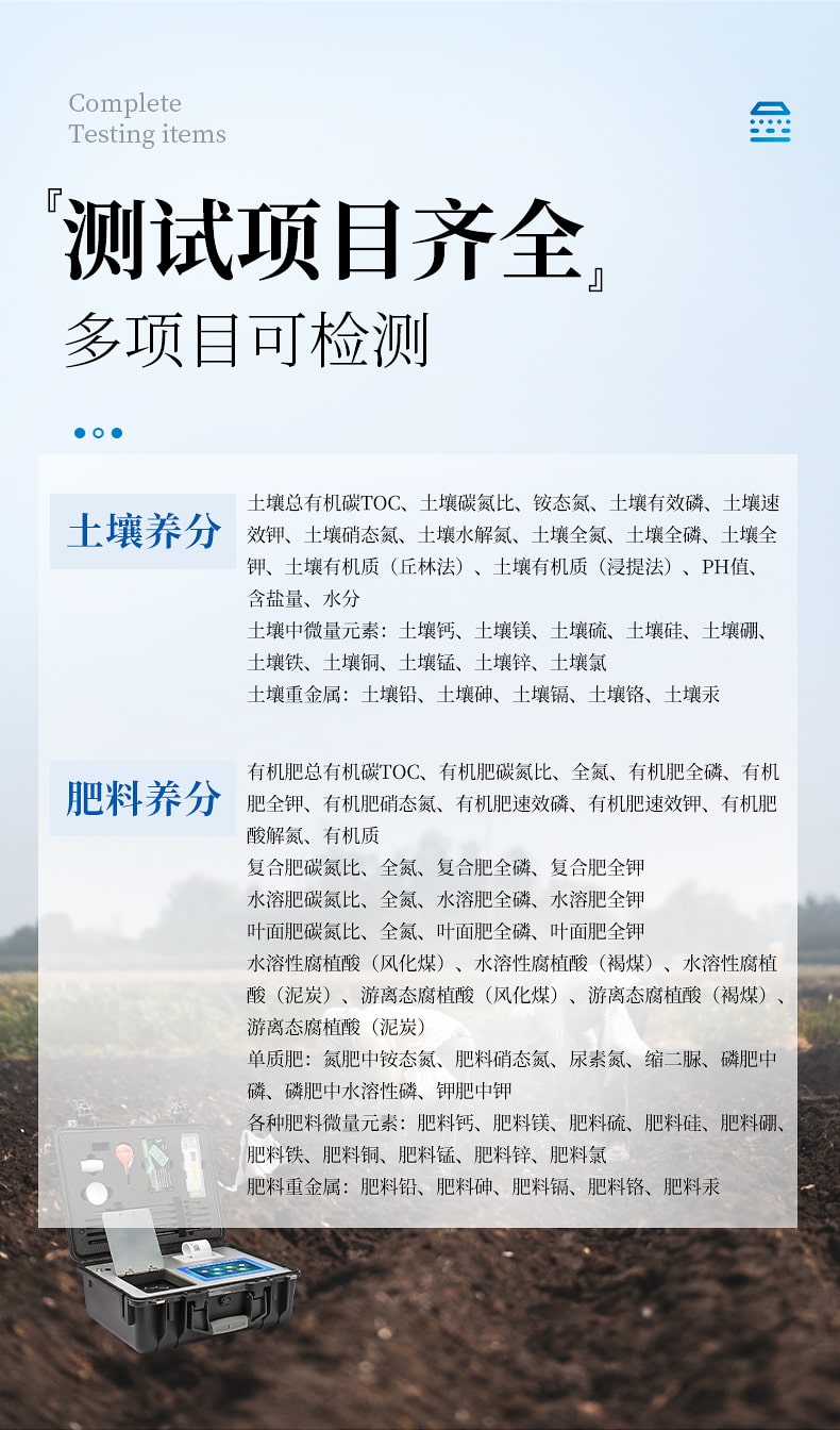 1、土壤養(yǎng)分:●土壤總有機碳TOC、土壤碳氮比、銨態(tài)氮、土壤有效磷、土壤速效鉀、土壤硝態(tài)氮、土壤水解氮、土壤全氮、土壤全磷、土壤全鉀、土壤有機質(zhì)(丘林法)、土壤有機質(zhì)(浸提法)、PH值、含鹽量、水分。●土壤中微量元素:土壤鈣、土壤鎂、土壤硫、土壤硅、土壤硼、土壤鐵、土壤銅、土壤錳、土壤鋅、土壤氯;●土壤重金屬:土壤鉛、土壤砷、土壤鎘、土壤鉻、土壤汞。